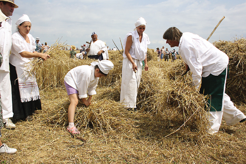 – A régiek ilyenkor már régen otthon voltak, mert a déli órákban pihentek. Reggel négy órától dolgoztak tízig, az aratást délután folytatták majdnem sötétedésig – mondja Buday József, a Lakhegyi Dalkör alkotta kisbanda kaszása. – Hát, nehéz munka volt ez régen, jómagam is csináltam, most már csak gyakorlom. Az aratás az év fő eseménye volt, akkor is készültek egyszerű, de laktató ételekkel, Kellett az erő a kemény fizikai munkához. Amikor végeztek, a hölgyeket meg-meghempergették a kepe tövében. Ez is hozzátartozott a dologhoz.